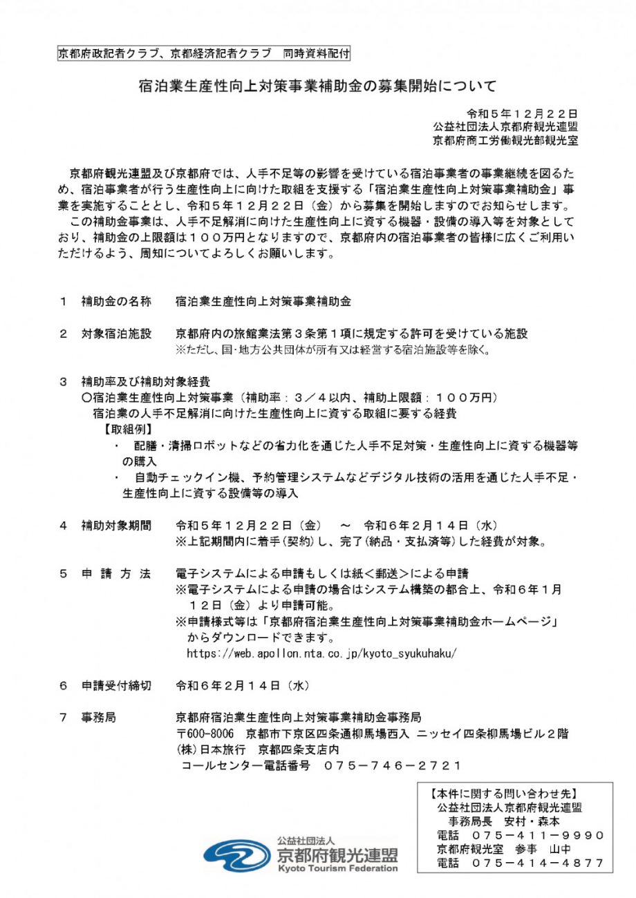 京都府観光連盟及び京都府では、人手不足等の影響を受けている宿泊事業者の事業継続を図るため、宿泊事業者が行う生産性向上に向けた取組を支援する「宿泊業生産性向上対策事業補助金」事業を実施することとし、令和5年12月22日(金)から募集を開始しますのでお知らせします。
