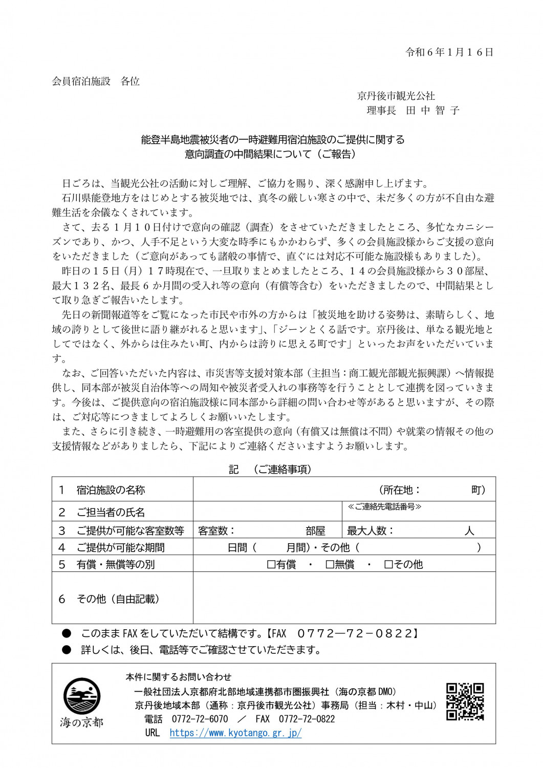 能登半島地震被災者の一時避難用宿泊施設のご提供に関する意向調査の中間結果について(ご報告)