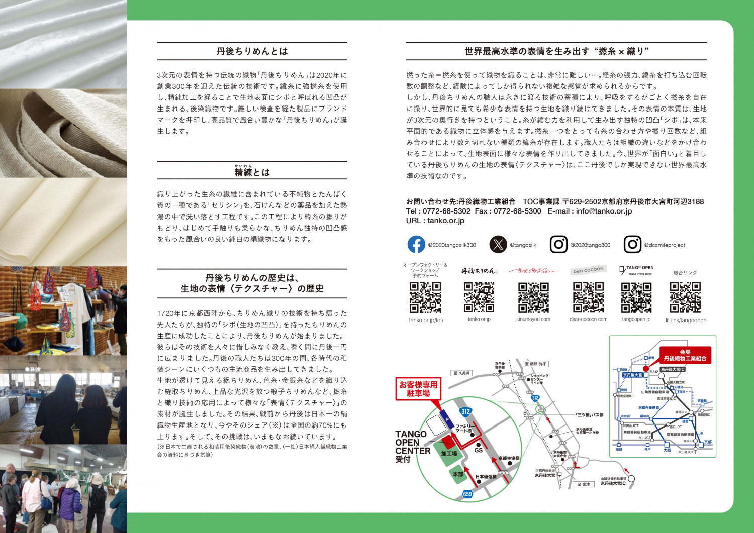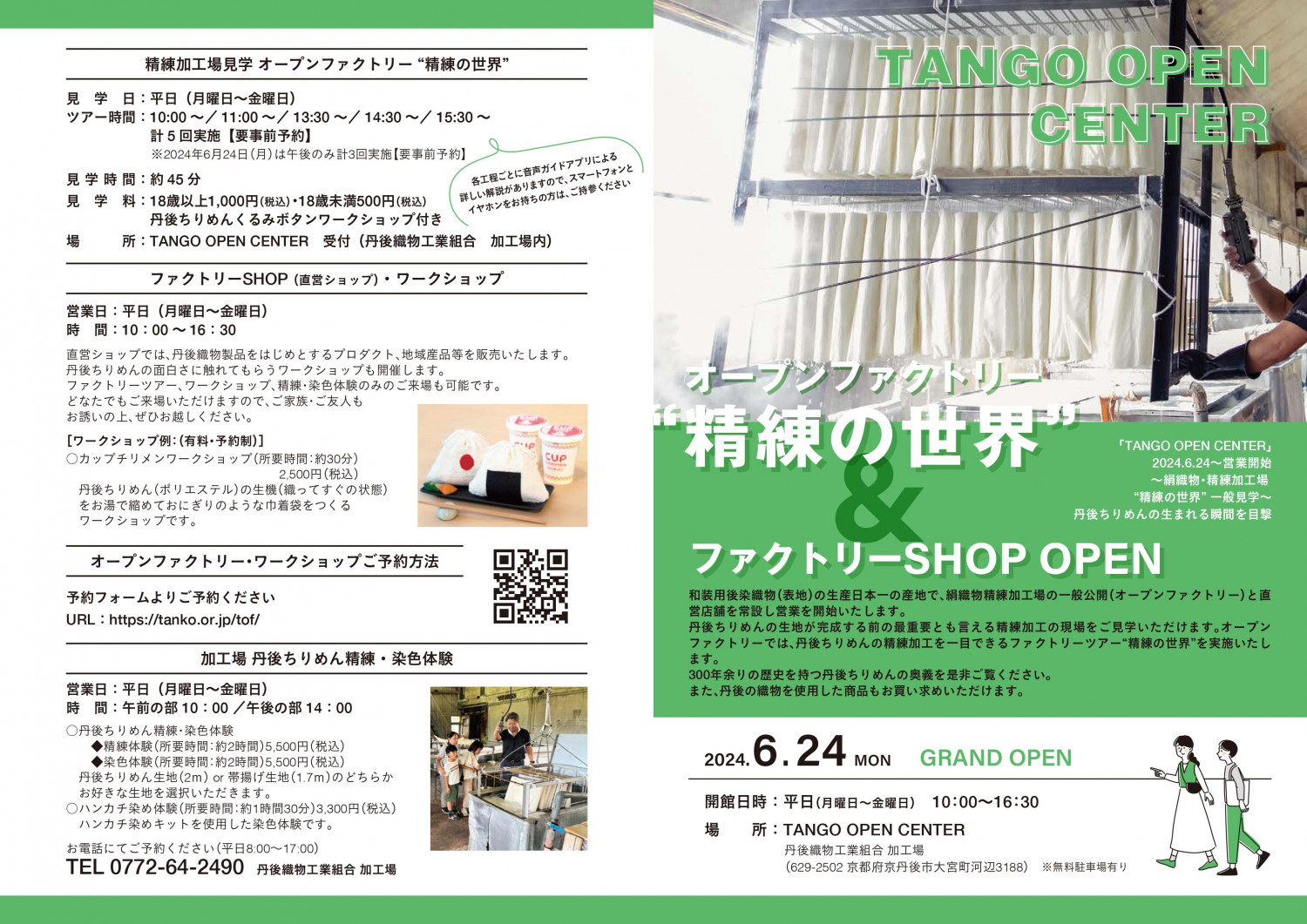 この度、丹後織物工業組合(所在地:京都府京丹後市、理事長 田茂井勇人)は、令和6年6月24日(月)から、和装用後染絹織物(表地)の生産量日本一の産地で、絹織物精練加工場の一般公開(オープンファクトリー)と直営店舗を常設し営業を開始いたします。丹後ちりめんの生地が完成する前の最重要とも言える精練加工の加工現場の見学が可能となります。オープンファクトリーでは、丹後ちりめんの精練加工を一目できるファクトリーツアー“精練の世界”を実施いたします。300年余りの歴史を持つ丹後ちりめんの奥義を是非ご覧ください。また、ファクトリーショップでは丹後の織物を使用した商品もお買い求めいただけます。2022年に発表した産地振興プランに基づき、2023年にTOV(TANGO OPEN VILLEGE)構想を取りまとめました。第1弾となるTANGO OPEN CENTERの開設に伴い、6月24日(月)9時45分よりオープニングセレモニーを開催いたします。