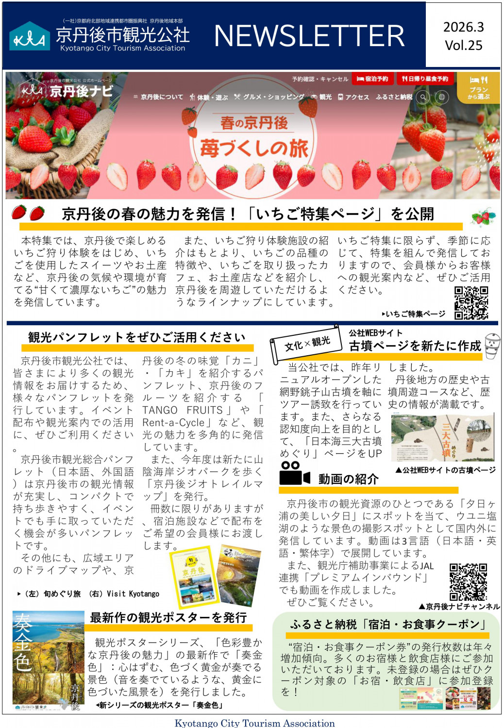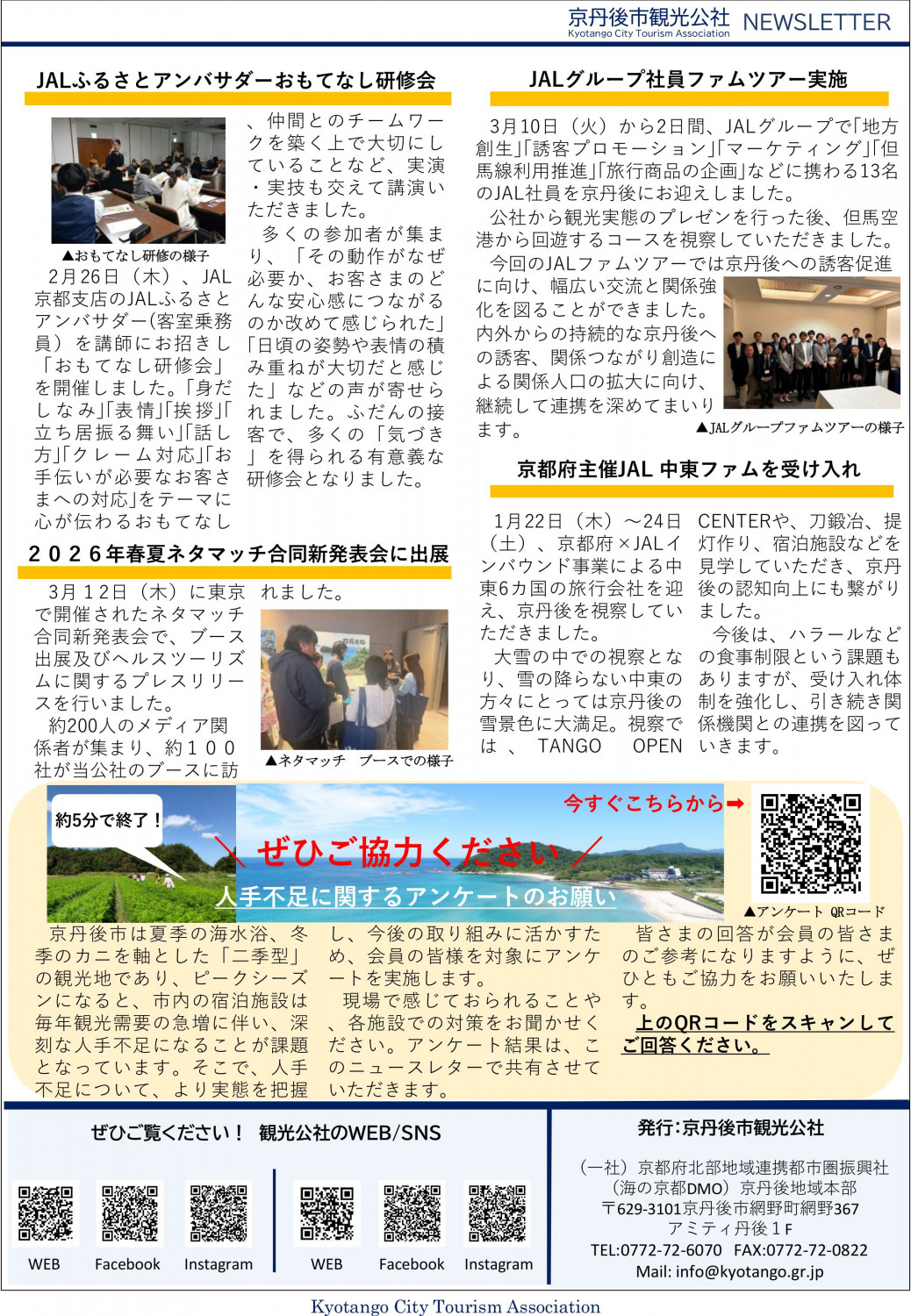 会員向けトピックス 2026.03.31 KTA NEWSLETTER Vol.25 京丹後市観光公社ニュースレターVol.25ダウンロード 投稿ナビゲーション JALふるさとアンバサダー(客室乗務員)による「おもてなし研修会」を開催します!