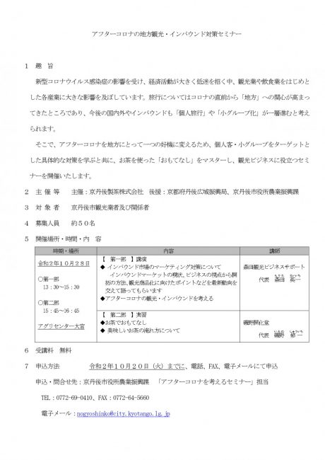 アフターコロナを地方にとって一つの好機に変えるための、個人客・小グループをターゲットとした具体的な対策を学び、お茶を使った「おもてなし」をマスターしていただく、観光ビジネスに役立つ「アフターコロナの地方観光・インバウンド対策セミナー」が10月28日アグリセンター大宮で開催されます。
