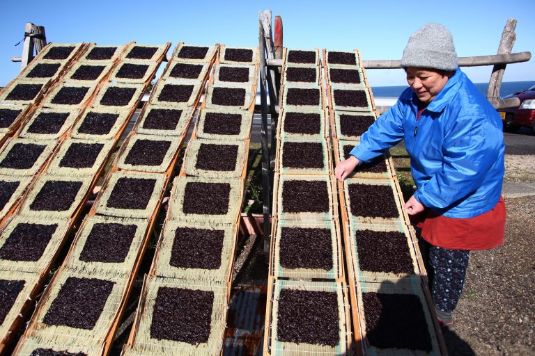 - 摘んできた海苔はすぐ洗い、専用のゴザに均一にのばされ、天日に干した。出来栄えのよさに漁婦は笑顔を見せた。
