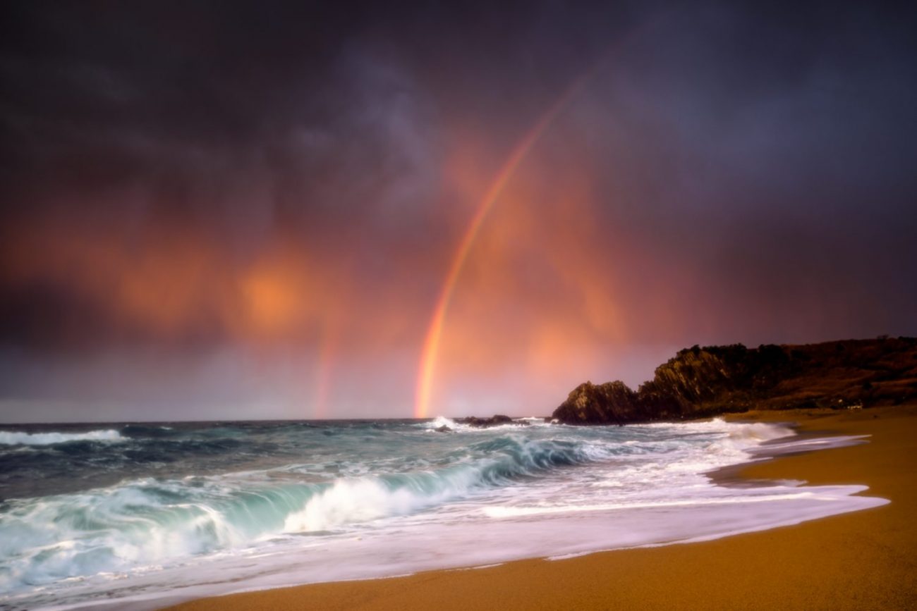 - 光の色と波の動きが複雑に混じる躍動感ある画面の中に、堂々と存在する立岩が象徴的です。スローシャッターを使った撮影が効果的です。