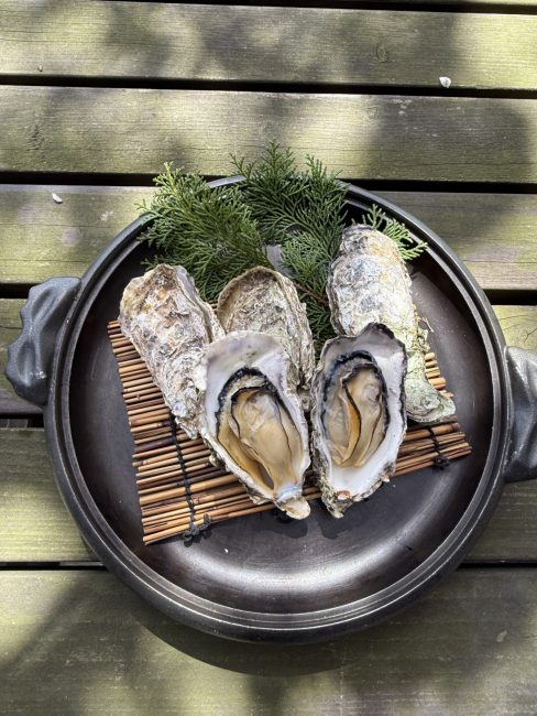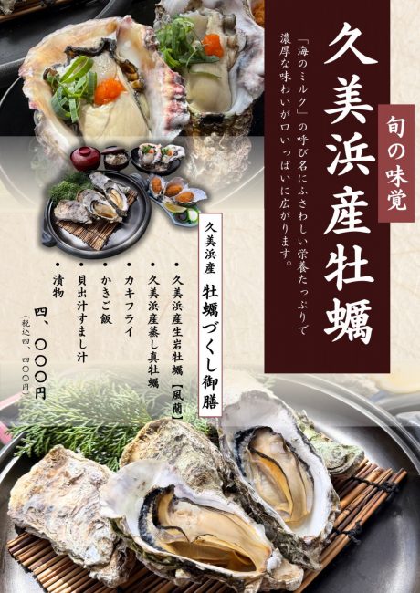 こだわりの自家養殖『久美浜産岩牡蠣【風蘭】』 6月〜10月は久美浜産の生岩牡蠣が旬を迎えます 海のミルクの呼び名にふさわしい栄養たっぷりで濃厚な味わいが口いっぱいに広がります。 当店おすすめ『牡蠣づくし御膳』 生岩牡蠣【風蘭】、蒸し牡蠣、牡蠣ご飯、カキフライと、久美浜の牡蠣を思う存分堪能していただける御膳となっております。 ぜひご賞味ください!11月~5月までは食べ放題の「牡蠣小屋」も!