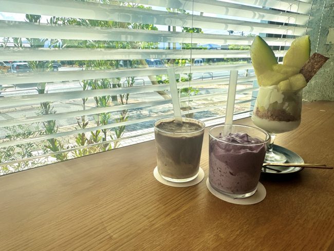 地元農家から直接仕入れた旬の果物で作るスムージーやパフェが食べられる花屋併設のカフェ。