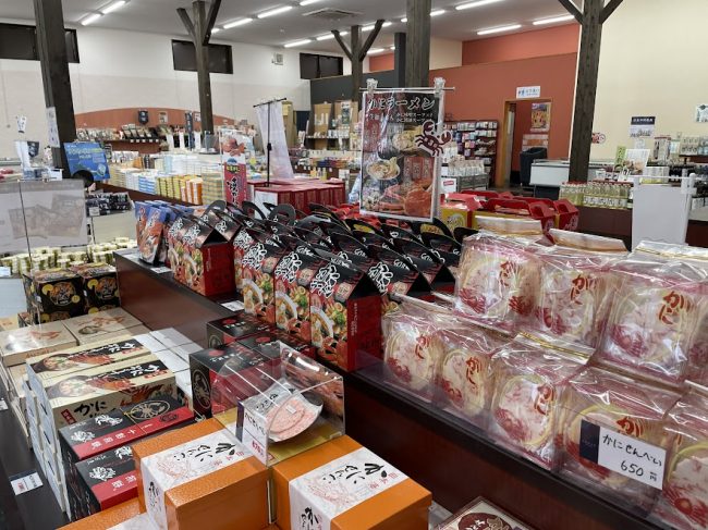 お土産店では、丹後の地酒や旬の農産物・果物、お菓子や調味料など幅広い商品を取り揃えております。また、鮮魚店では、新鮮な魚介類を販売。刺身や干物、お惣菜なども。