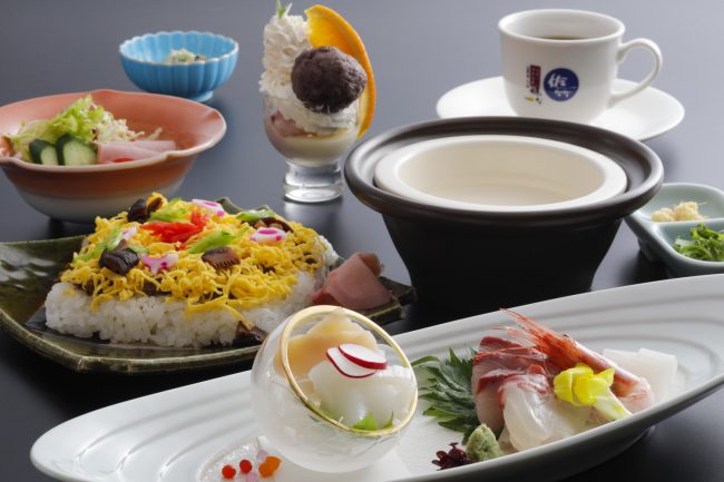 - 新鮮な海鮮を使用したお刺身(5種盛)と、丹後名物のばら寿しがセットになった「ばら寿し刺身ご膳」