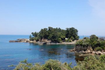 「屏風岩」は高さ13mの安山岩で、海面からそそり立つ様が屏風をたてたような形にみえることから名付けられました。北西の方に小さい岩が5つほど海に浮かび、それがちょうど一直線に連なり、台地の亀裂の変化を物語っています。国道178号線沿いに展望所があり、屏風岩の景観をじっくりと眺める事ができます。