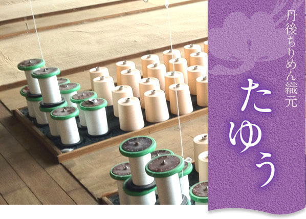 丹後ちりめんは、京都府丹後地方で織られる後染め織物のことを指します。経糸には撚りのない生絹を使い、緯糸には強撚糸を使用しています。